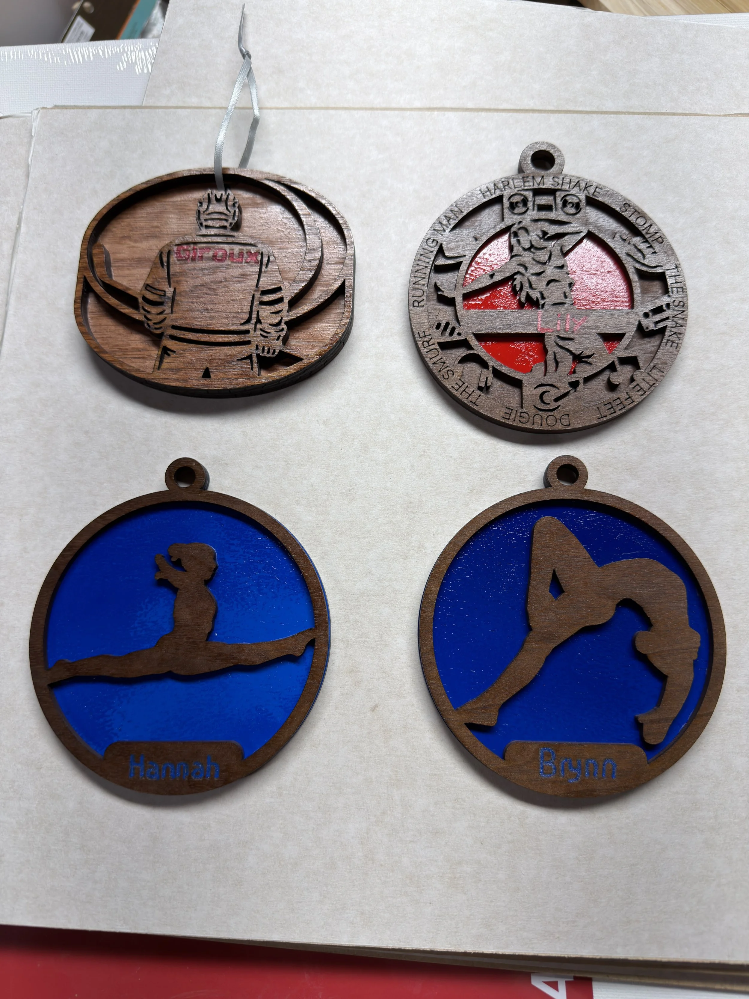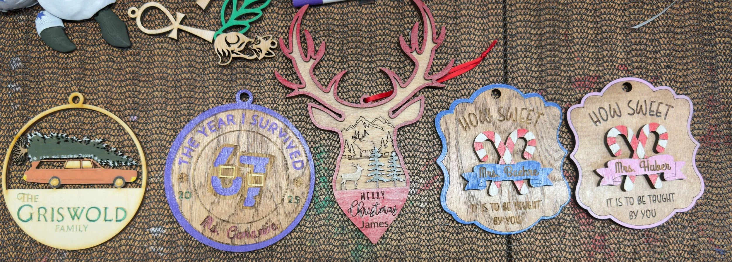 Hand painted or stained wood and acrylic ornaments. many different styles, designs and themes.